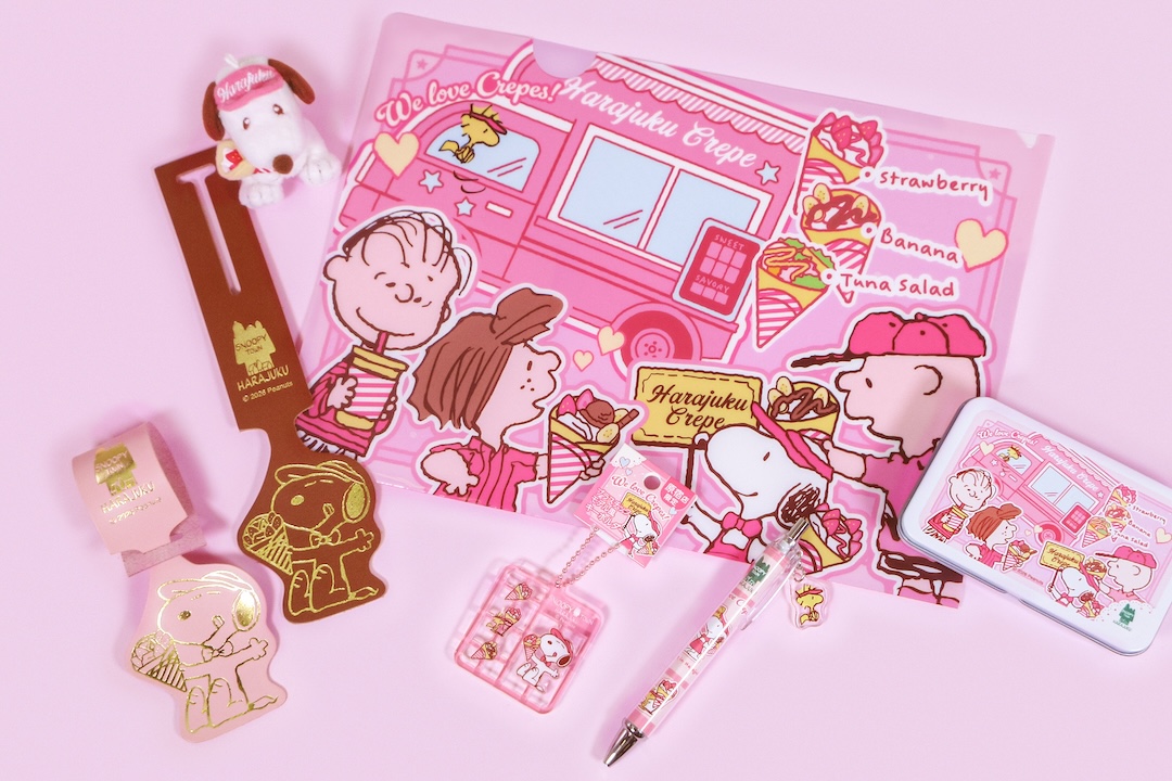 原宿店の内装にぴったりなピンクを基調に、PEANUTSのなかまたちがクレープを楽しんでいる様子!