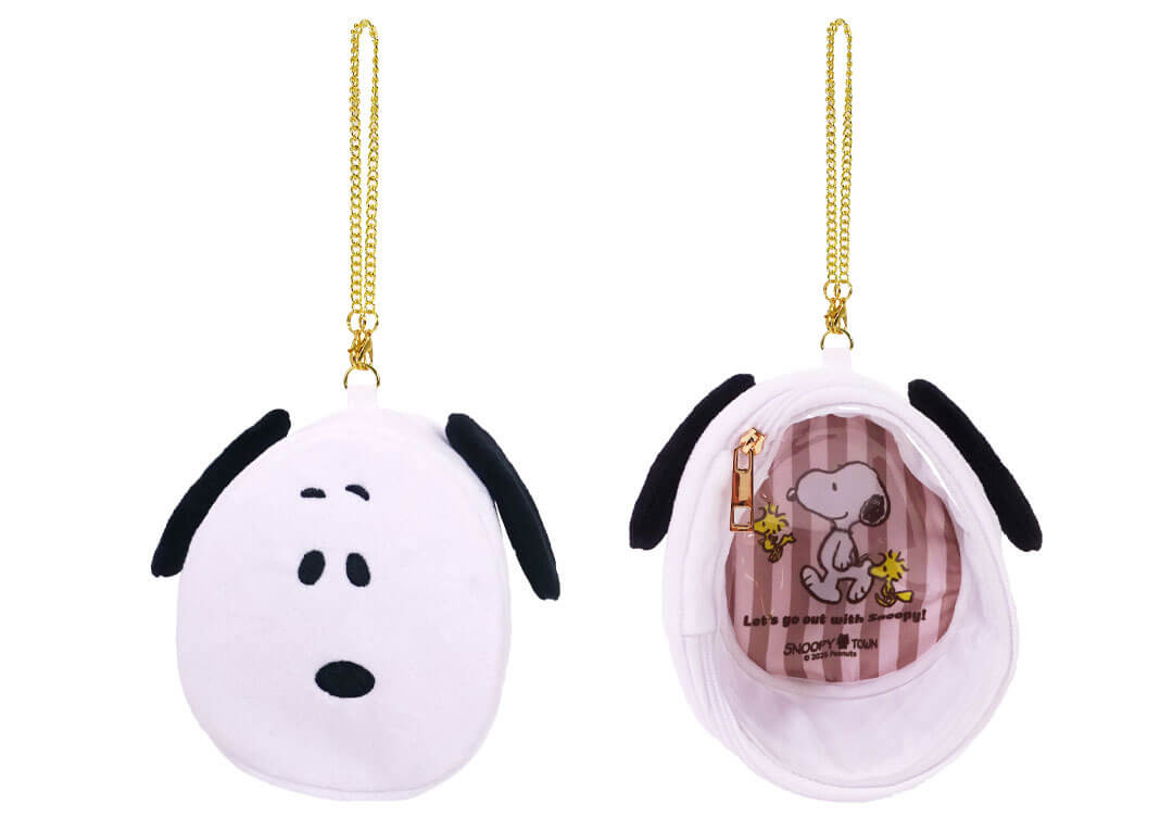 バッグに付けられるチェーン付きのスヌーピー型フェイスポーチ。