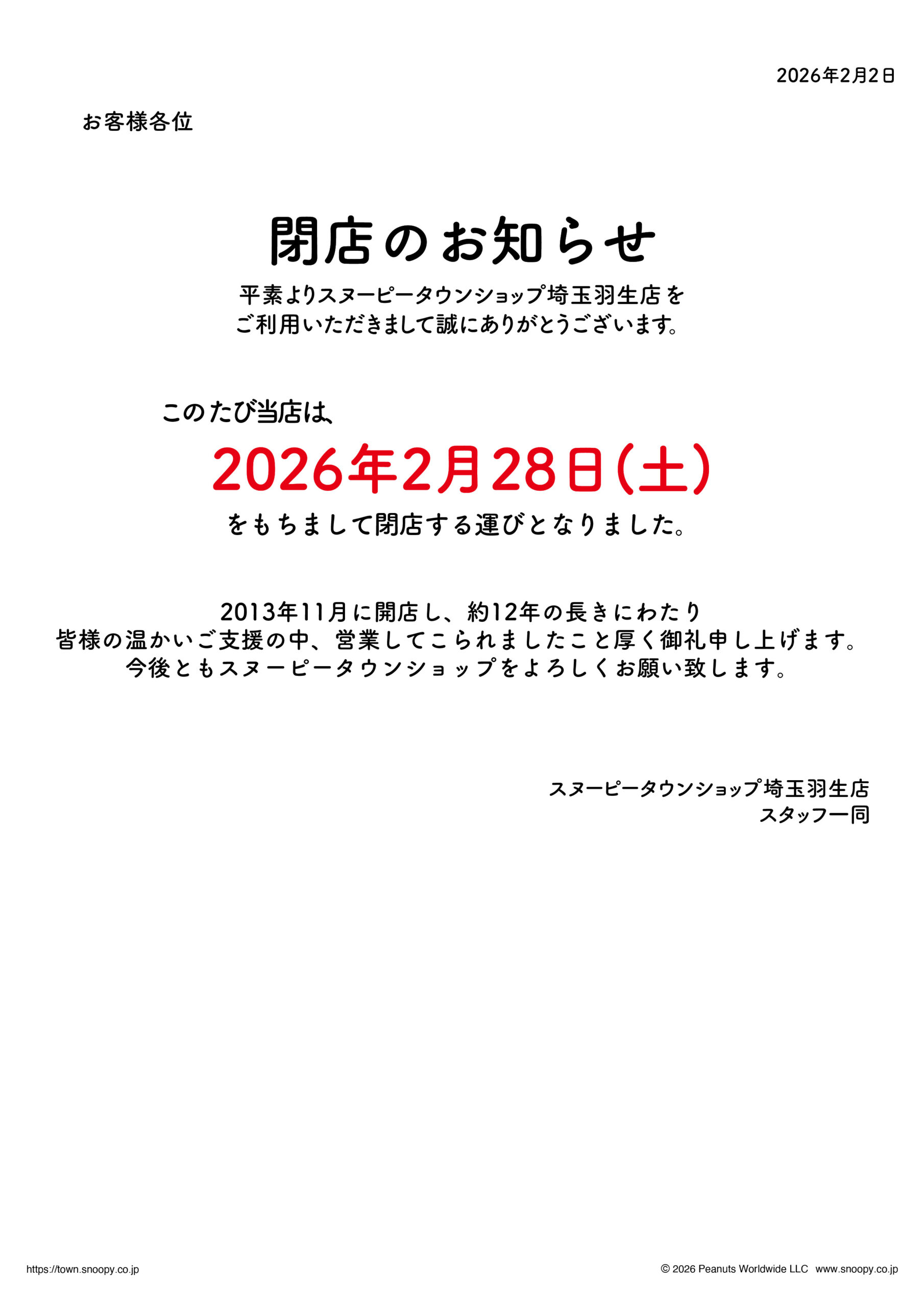 【閉店のお知らせ】スヌーピータウンショップ埼玉羽生店