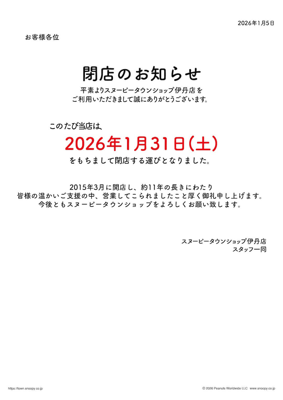 【閉店のお知らせ】スヌーピータウンショップ伊丹店